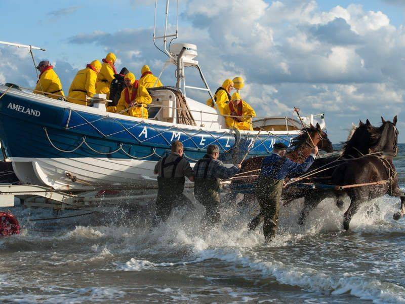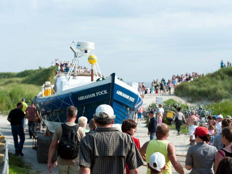 Zehn kräftige Pferde ziehen das Rettungsboot mit donnernden Hufen über den Strand durch die Brandung ins Meer. Es ist ein Erlebnis aus früheren Zeiten. Wenn heute ein Schiff in Seenot gerät, fährt das moderne Rettungsboot „Anna Margaretha” mit hoher Geschwindigkeit aus dem Hafen der Insel aus.